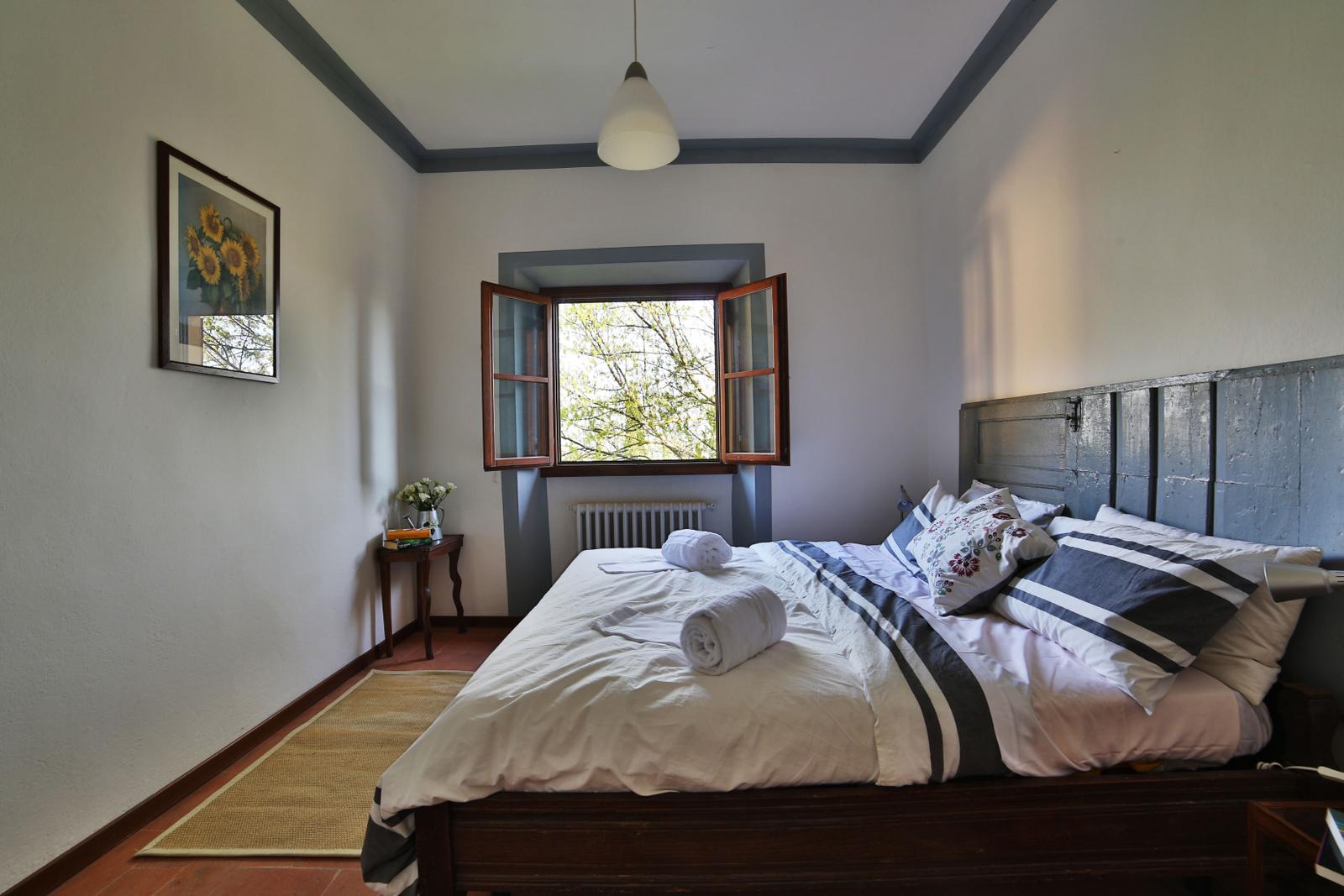 La camera da letto di questo appartamento del Bed & Breakfast di Fattoria Pagnana ha una vecchia porta in legno massiccio come splendida testata e può essere composta da un letto matrimoniale o due letti singoli.