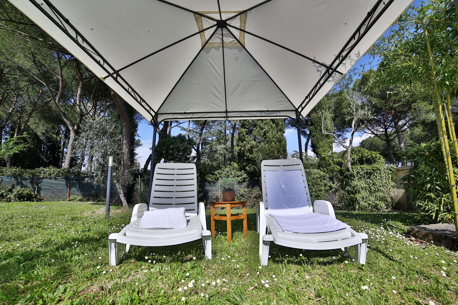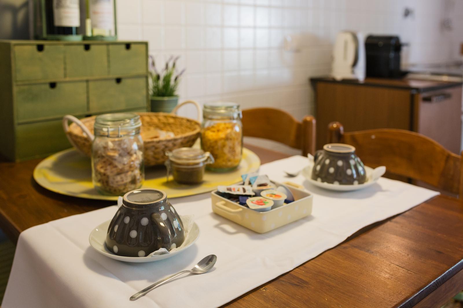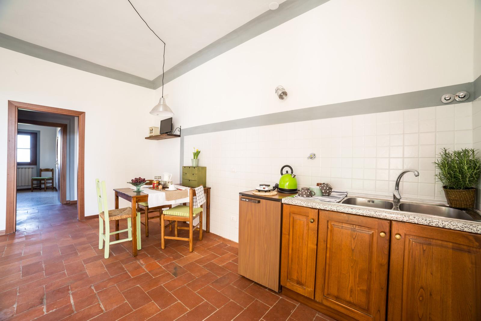 Nella luminosa area giorno con kitchenette si trova il tavolo apparecchiato per la colazione, che si può consumare nella riservatezza dell’appartamento o ai tavolini all’aperto che si affacciano nel giardino del Loggiato.